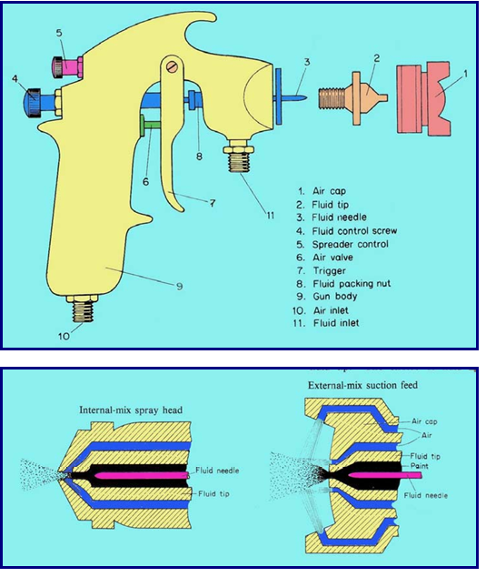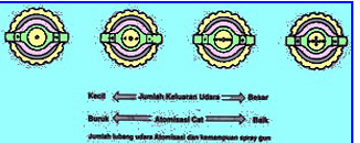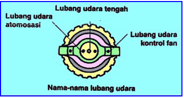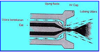 berikut, lubang udara tengah untuk membuat kevakuman pada fuid tip dan menyemprotkan cat, lubang udara kontrol fan menggunakan tenaga udara kompresor untuk menentukan bentuk pola semprotan, dan lubang udara atomisasi untuk menyebarkan atomisasi cat.