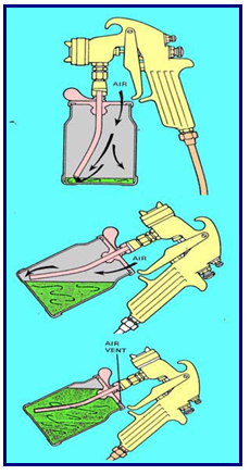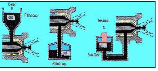 Dalam garis besarnya, spray gun dapat dibagi menjadi tiga tipe, yaitu: tipe umpan-berat (gravity-feed), umpan-hisap (suction-feed), dan tipe kompresi (compression). Untuk lebih jelasnya dapat dilihat gambar berikut ini.