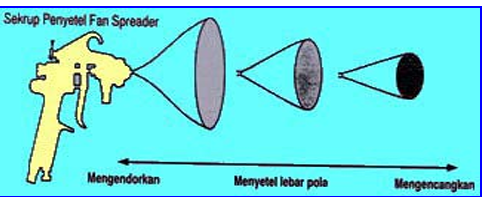jumlah pengeluaran cat, dan mengencangkan sekrup mengurangi jumlah pengeluaran cat. Pengencangan sekrup penyetel sepenuh langkah, akan menghentikan aliran cat.