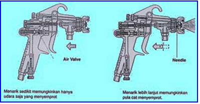 Menarik trigger akan menyebabkan udara dan cat menyemprot. Trigger bekerja didalam dua tahap. Menarik trigger pada permulaan akan membuka katup udara, sehingga hanya udara saja yang menyemprot. Menarik trigger lebih lanjut, akan menyebabkan jarum terbuka, sehingga cat menyemprot bersamaan dengan udara. Tipe konstruksi ini dirancang untuk membuat atomisasi yang konsisten pada saat trigger ditarik.
