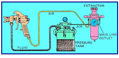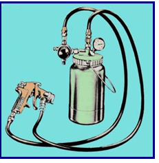 Spraygun terpisah dengan tabung catnya sehingga lebih ringan dan mudah melakukan pengecatan dalam berbagai posisi. Mulut spraygun dirancang bukan untuk menghasilkan kevakuman seperti model lainnya, berfungsi hanya sebagai mulut penyempot cat yang sudah menjadi gas. Pada tabung cat sudah diberikan tekanan sehingga cat keluar karena tekanan angin dari dalam tabung cat.